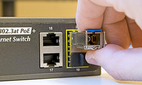 SFP (Small Form-factor Pluggable) is a small pluggable optical module used to transmit optical signals between network devices.