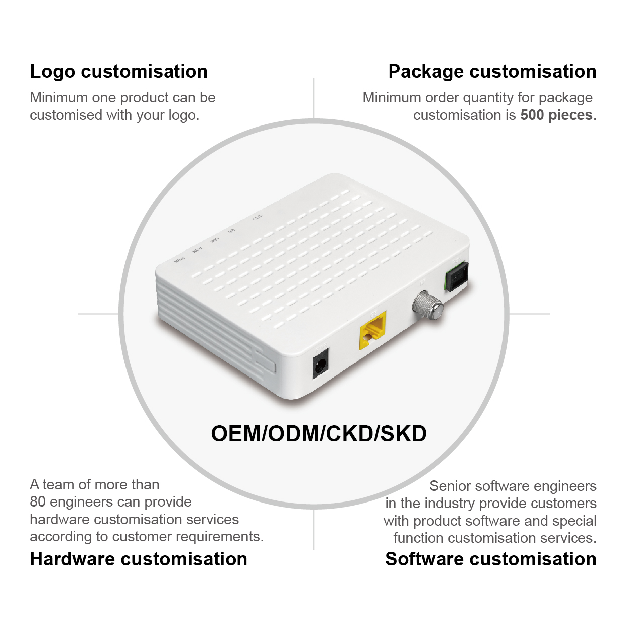The ONU CATV XPon G53C is a Pon network device with HGU routing capabilities. It provides an uplink PON interface and an Ethernet and CATV interface on the downlink. It enables optical access solutions such as FTTH (fiber to the home) and FTTB (fiber to the building). It fully integrates the reliability, maintainability and security design of carrier-grade equipment to provide customers with last-mile broadband access services.